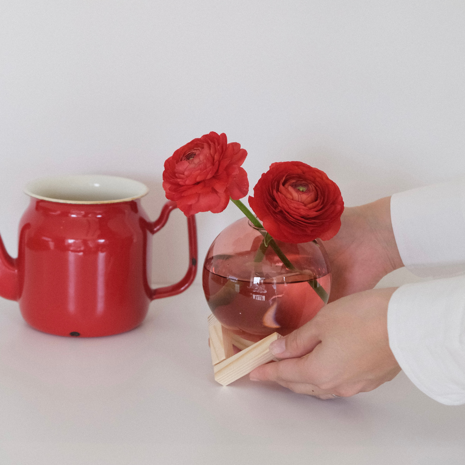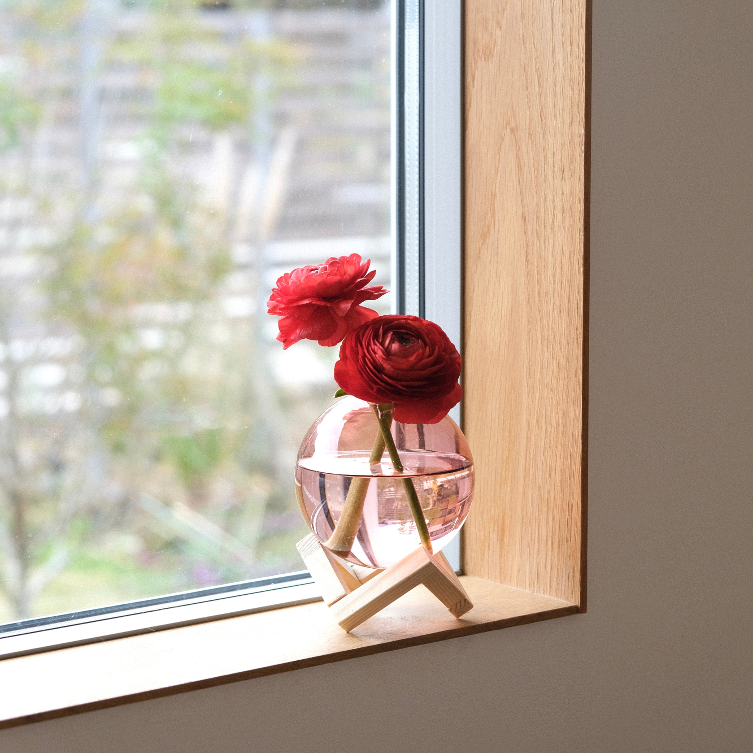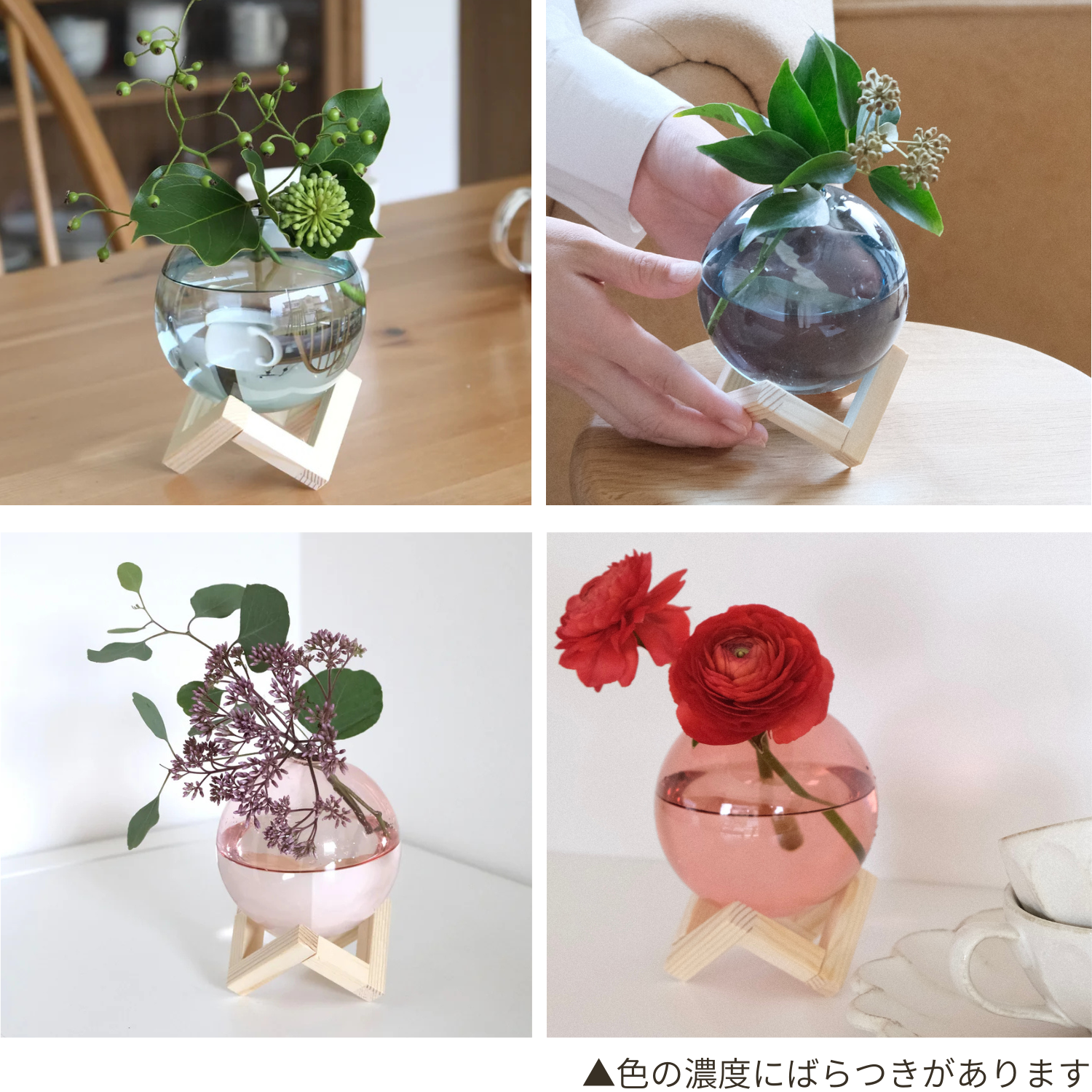 飾られたお花はもちろん、花瓶の中の水の動きも合わせて楽しむことができます。ガラスを支える木製のフレームは、どんなインテリアにもなじむので、飾る場所を選ぶことがありません。また、口の部分は小さくなっていて、少ない本数のお花でも倒れてしまうことがありません。