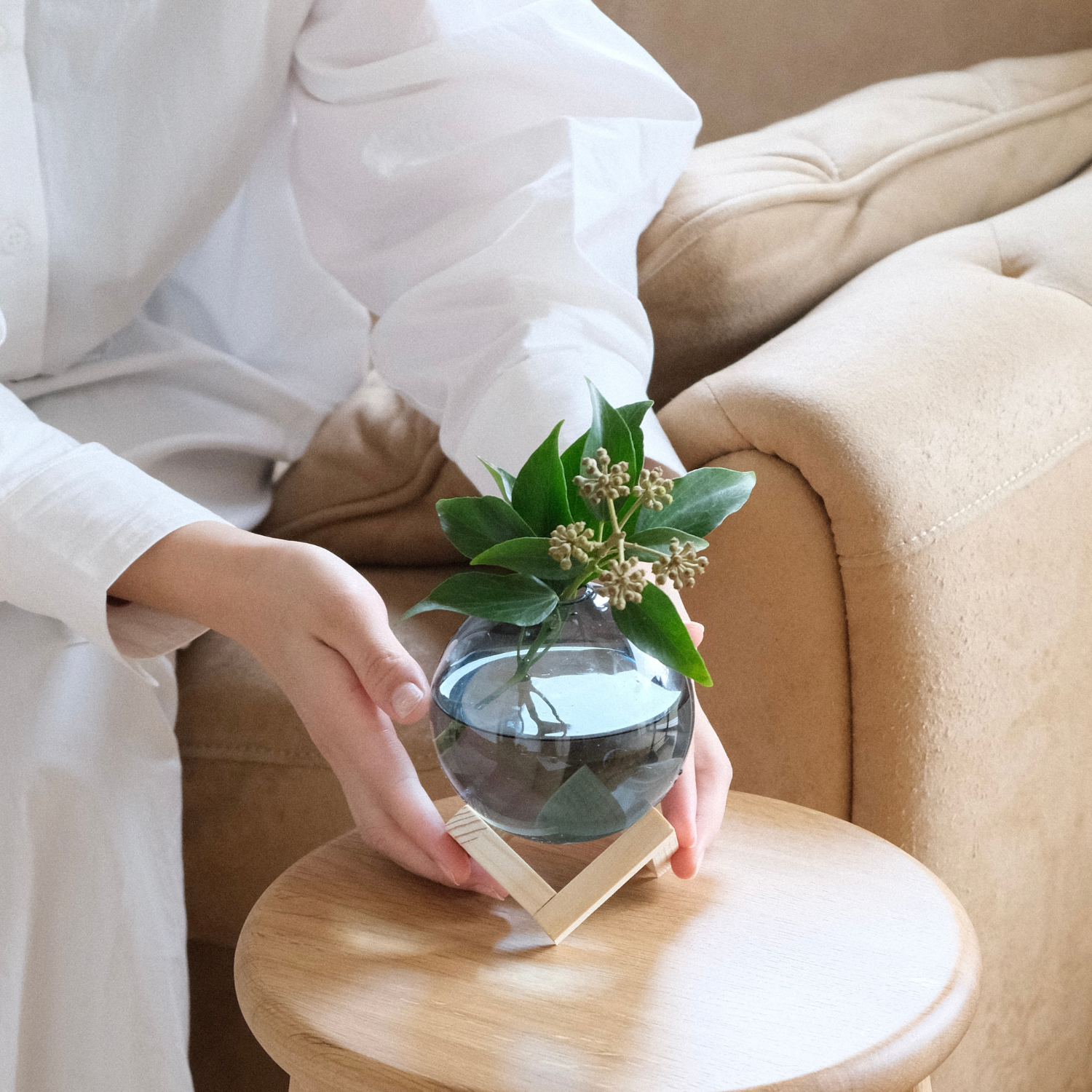茎が短いお花を活けるのにも適しています。直径10cm・高さ12cmと、片手にのる小さめのサイズ感は、「ちょっとお花を飾りたい方」「気軽に植物を楽しみたい」という方に特におすすめです。また大切な方にお花と一緒に送るのも良いでしょう。