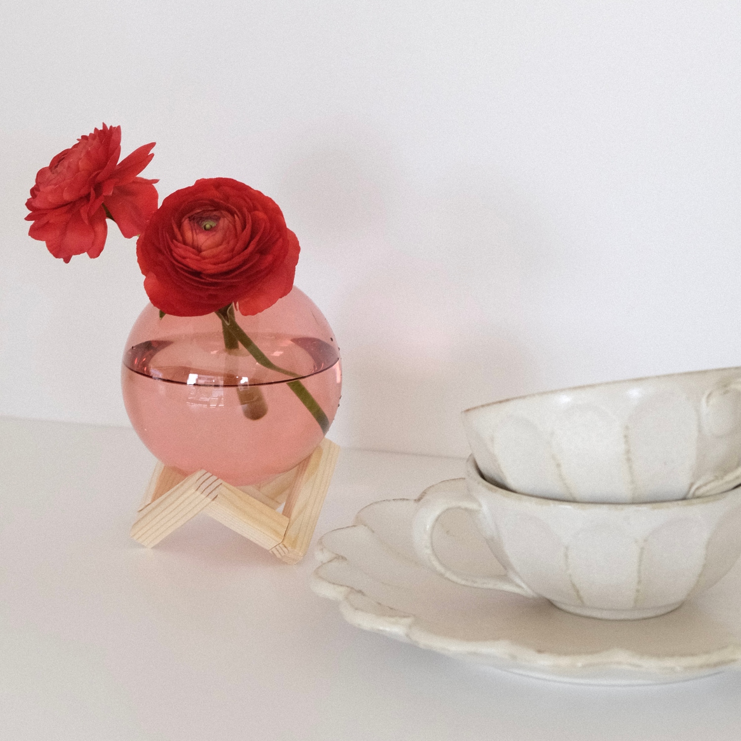 丸みを帯びていることで優しく温かみを感じさせるデザインになっています。ガラスの持つ透明感は、中に張った水と見事に調和します。